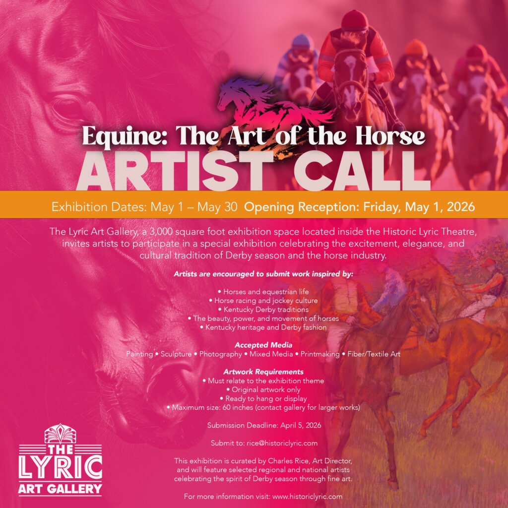 The Lyric Art Gallery, a 3,000 square foot exhibition space located inside the historic Lyric Theatre, invites artists to participate in a special exhibition celebrating the excitement, elegance, and cultural tradition of Derby season and the horse industry.